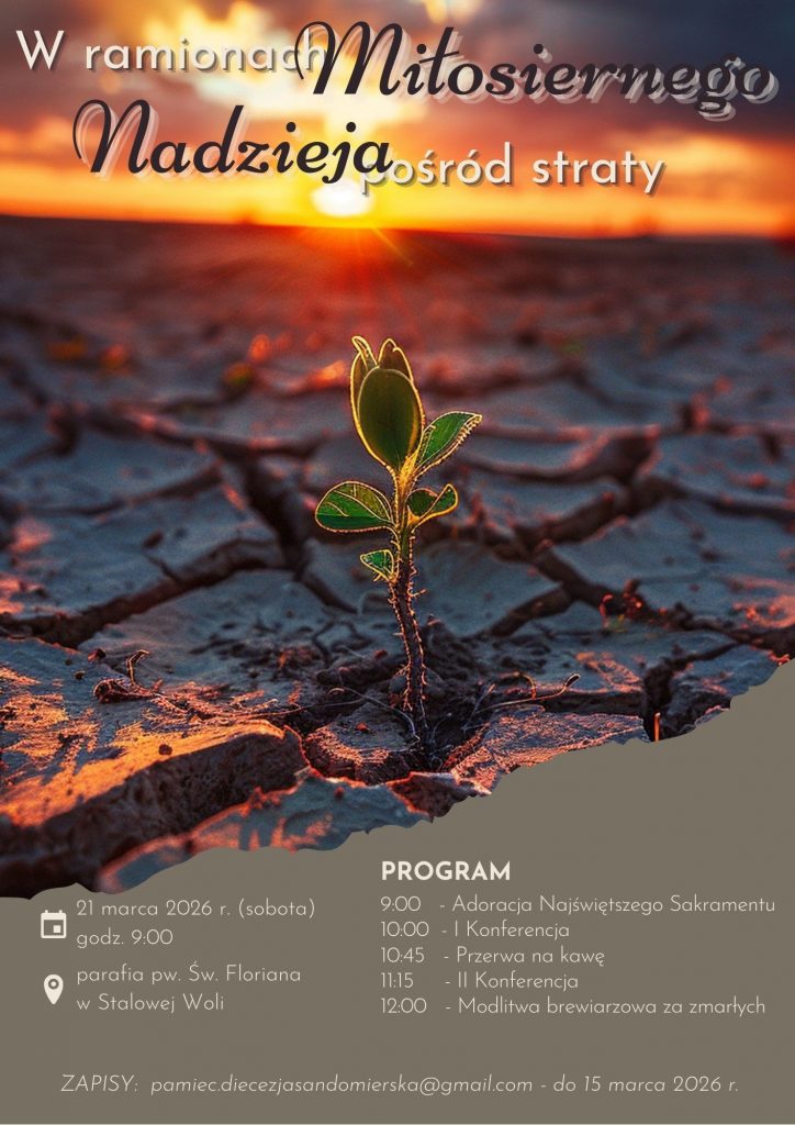 10. W sobotę 21 marca br. w parafii pw. św. Floriana w Stalowej Woli odbędzie się Wielkopostny Dzień Skupienia dla osób, które utraciły kogoś bliskiego. Zapisy do 15 marca br. (e-mail: pamiec.diecezjasandomierska@gmail.com). Szczegółowe informacje na plakacie.